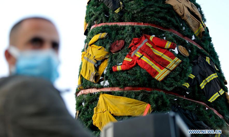 Clothes and equipments belonging to firefighters who died in the Beirut port blasts are placed on a Christmas tree in Beirut, Lebanon, on Dec. 20. 2020. A Christmas tree is set up on Sunday near the Beirut port to commemorate firefighters who died in the Beirut port blasts on August 4. Photo: Xinhua