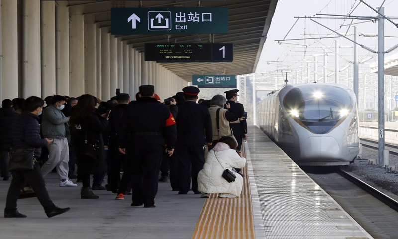 The G8311-bullet train from Hefei in East China's Anhui Province arrived at Anqing Station at around 10 am on Tuesday, marking the start of the Hefei-Anqing high-speed railway's operation. Photo: VCG