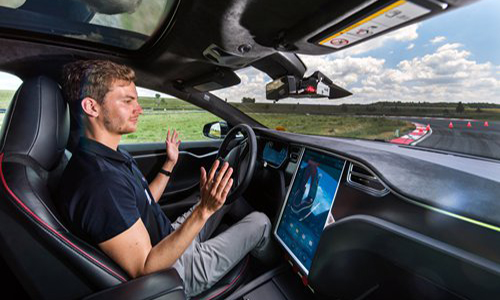 A test driver removes his hands from the steering wheel of a Tesla Motors Inc Model S electric automobile fitted with self driving technology, developed by Robert Bosch GmbH, during the Bosch mobility experience in Boxberg, Germany. Photo: CFP