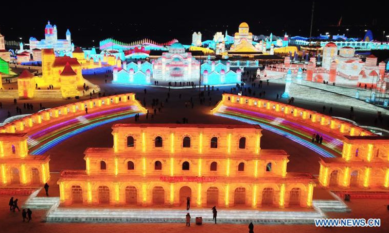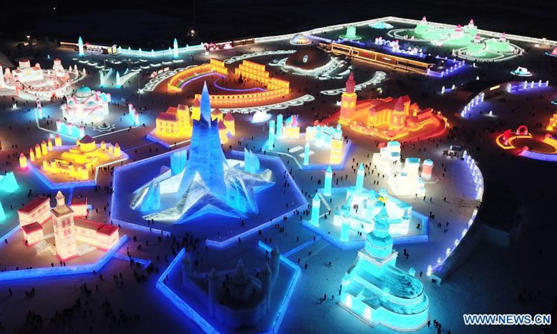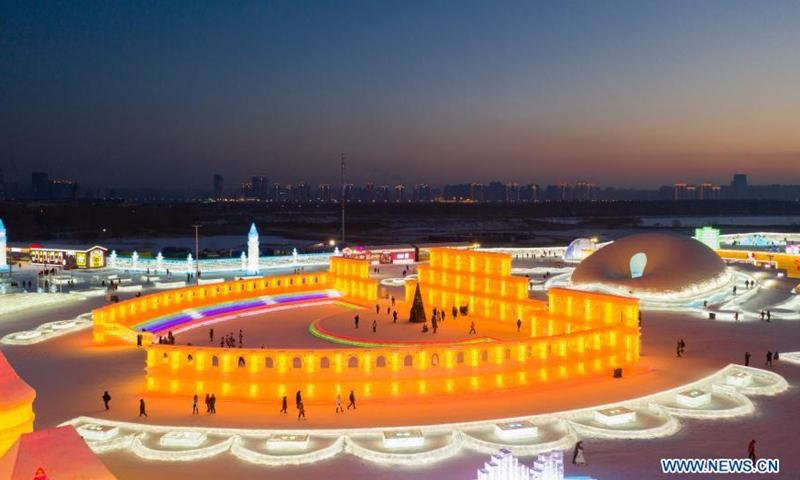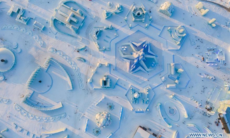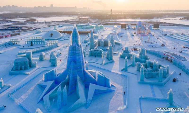 Aerial photo shows a view of the Harbin Ice-Snow World in Harbin, northeast China's Heilongjiang Province, Dec. 24, 2020. The 22nd Harbin Ice-Snow World opened to the public on Thursday.Photo:Xinhua
