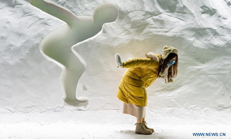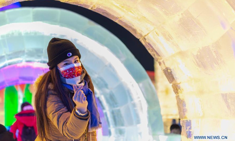 A tourist plays at the Harbin Ice-Snow World in Harbin, northeast China's Heilongjiang Province, Dec. 24, 2020. The 22nd Harbin Ice-Snow World opened to the public on Thursday.Photo:Xinhua