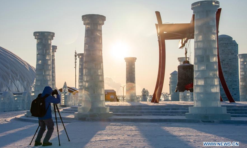 A tourist takes photos at the Harbin Ice-Snow World in Harbin, northeast China's Heilongjiang Province, Dec. 24, 2020. The 22nd Harbin Ice-Snow World opened to the public on Thursday.Photo:Xinhua
