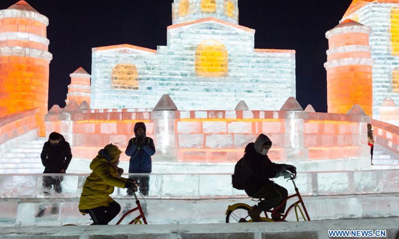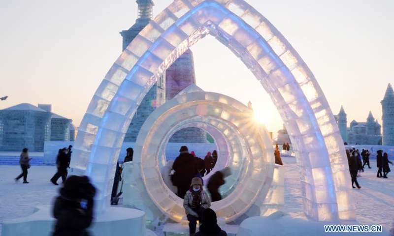 Tourists play at the Harbin Ice-Snow World in Harbin, northeast China's Heilongjiang Province, Dec. 24, 2020. The 22nd Harbin Ice-Snow World opened to the public on Thursday.Photo:Xinhua