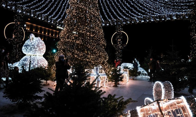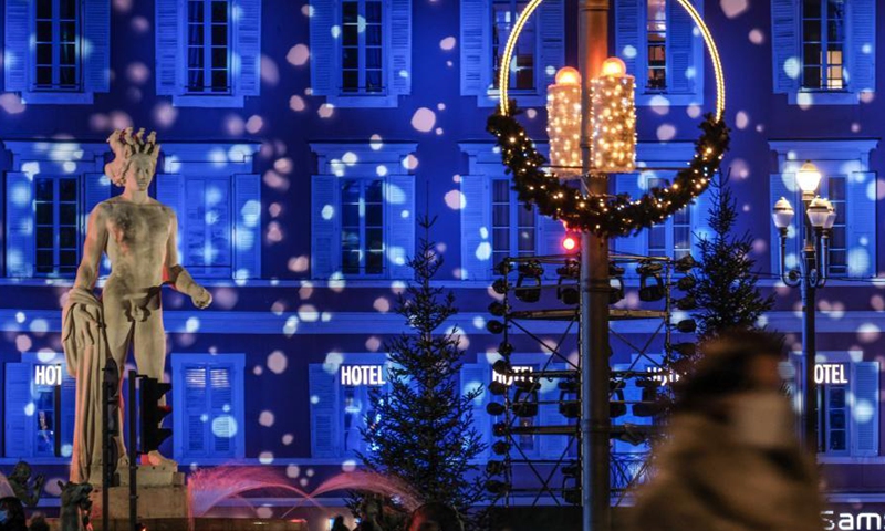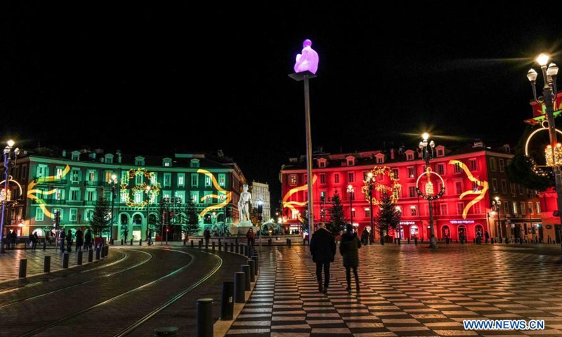 People look at the Christmas illuminations in Nice, southern France, Dec. 24, 2020.Photo:Xinhua