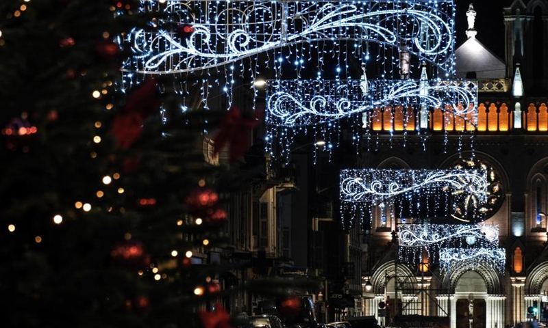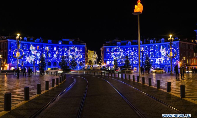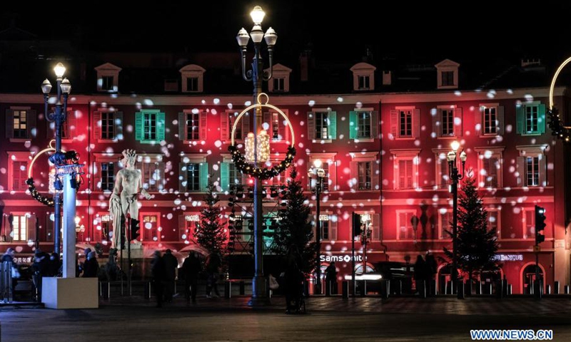 Christmas decorations are illuminated in Nice, southern France, Dec. 22, 2020.Photo:Xinhua