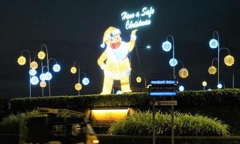 An illuminated Santa Claus wearing a mask and holding a sign with words "Have a safe Christmas" is seen by a road in Colombo, Sri Lanka, on Dec. 24, 2020.Photo:Xinhua