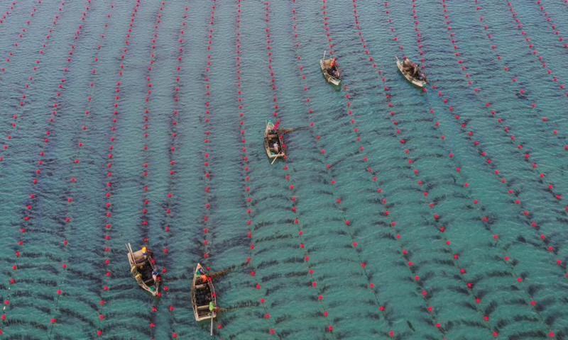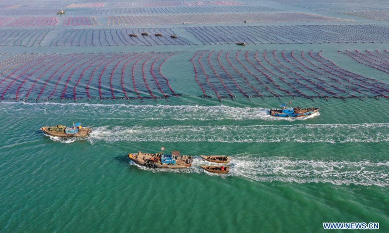 Aerial photo taken on Dec. 24, 2020 shows people working on a marine ranch in Rongcheng, east China's Shandong Province.Photo:Xinhua