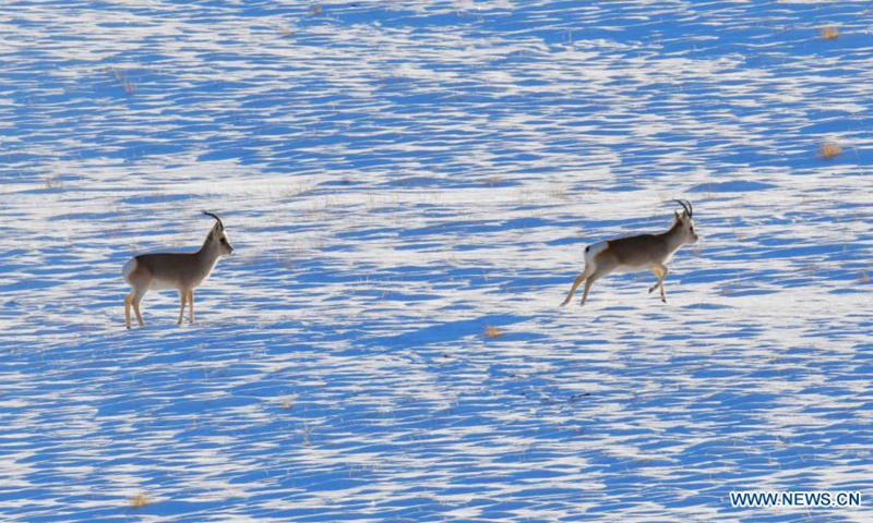 Tibetan gazelles forage at the Haltent grassland in the Kazak Autonomous County of Aksay, northwest China's Gansu Province, Dec. 23, 2020.Photo:Xinhua