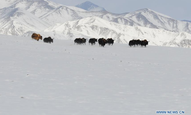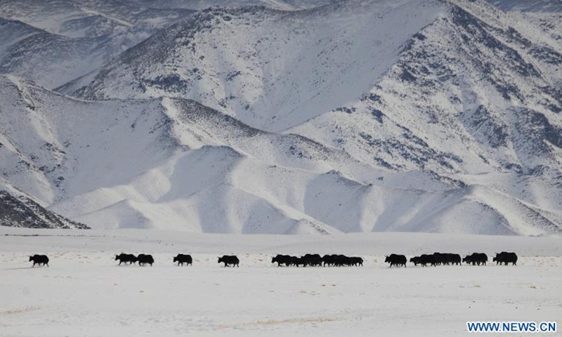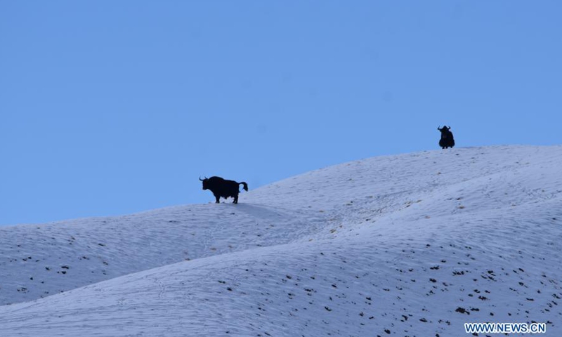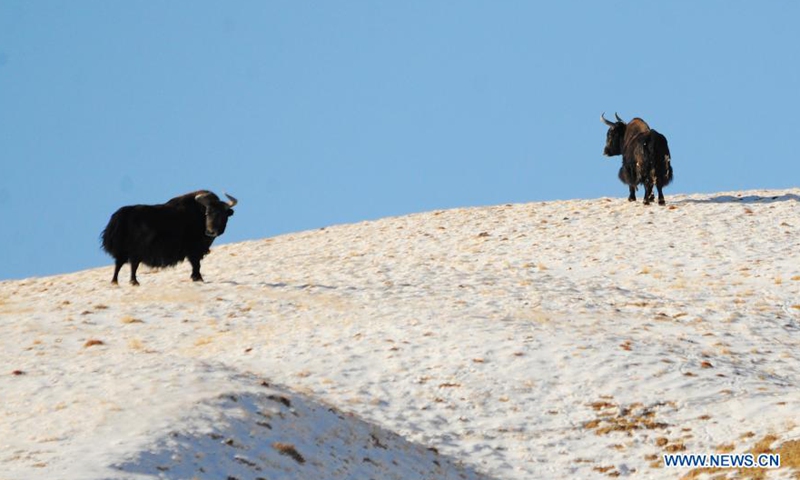 Wild yaks are seen at the Haltent grassland in the Kazak Autonomous County of Aksay, northwest China's Gansu Province, Dec. 23, 2020.Photo:Xinhua