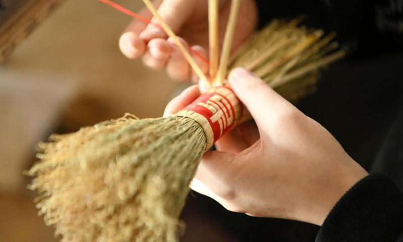 A villager makes a broom in Xiongying Village of Qiuzhuang Township in Langfang City, north China's Hebei Province, Dec. 24, 2020. In recent years, Qiuzhuang has strived to develop its broom making industry, as a way to help locals increase incomes. (Xinhua/Wang Xiao)