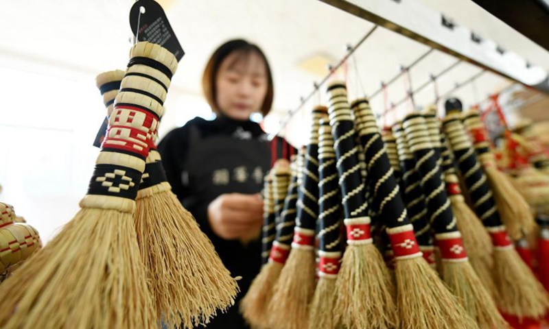 A villager sorts brooms in Xiongying Village of Qiuzhuang Township in Langfang City, north China's Hebei Province, Dec. 24, 2020. In recent years, Qiuzhuang has strived to develop its broom making industry, as a way to help locals increase incomes. (Xinhua/Wang Xiao)