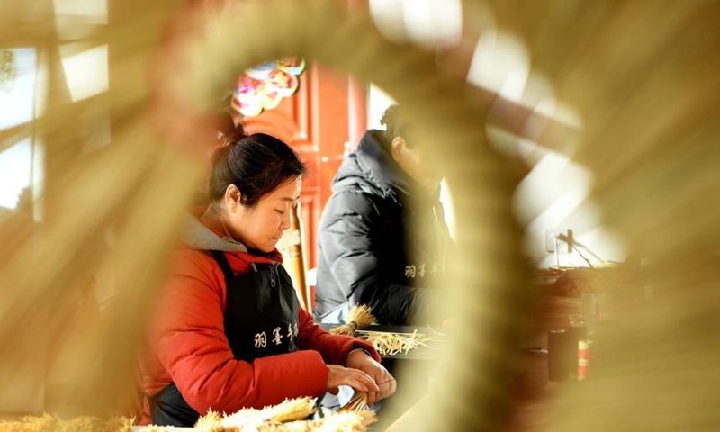 Villagers make brooms in Xiongying Village of Qiuzhuang Township in Langfang City, north China's Hebei Province, Dec. 24, 2020. In recent years, Qiuzhuang has strived to develop its broom making industry, as a way to help locals increase incomes. (Xinhua/Wang Xiao)