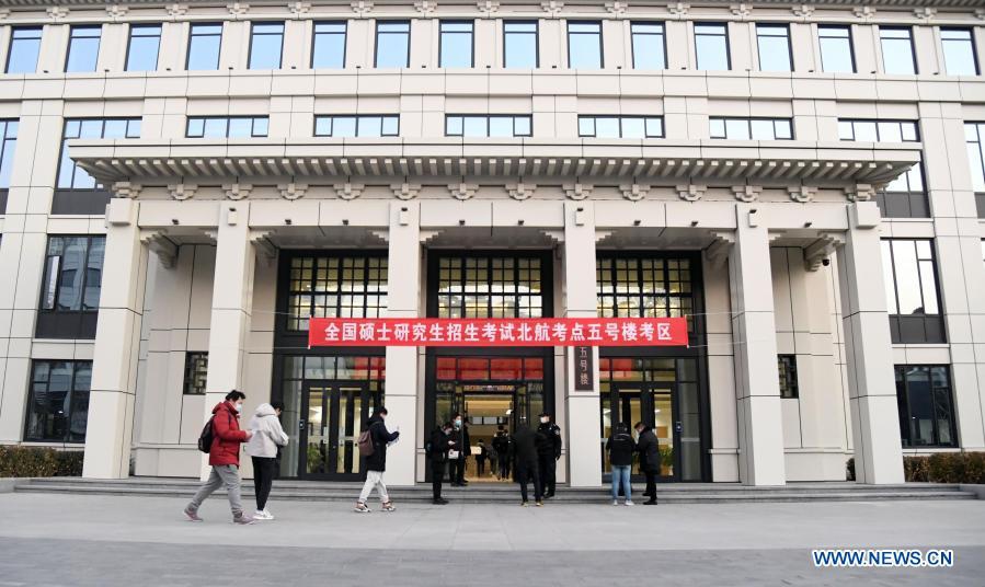 Examinees enter an examination site at Beihang University in Beijing, capital of China, Dec. 26, 2020. China's postgraduate admission exam kicked off on Saturday. (Xinhua/Ren Chao)