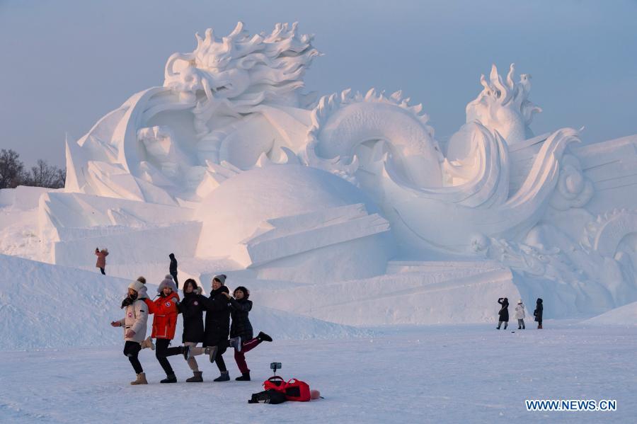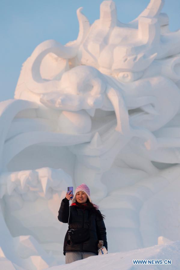 Tourists pose for photos at the 33rd Harbin Sun Island International Snow Sculpture Art Exposition in Harbin, northeast China's Heilongjiang Province, Dec. 25, 2020. (Xinhua/Xie Jianfei)