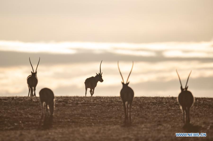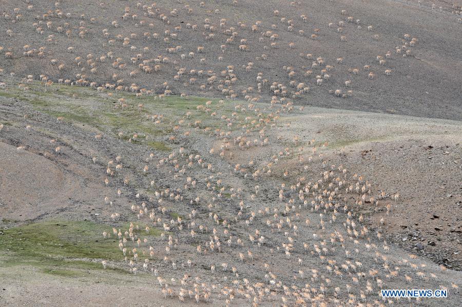 Photo taken on July 17, 2020 shows Tibetan antelopes in Rongmar Township of Nyima County, southwest China's Tibet Autonomous Region. With efforts from top to bottom, the Tibetan antelope population in Tibet has risen from around 50,000 in the 1990s to more than 200,000 today. The species has been brought back from the brink of extinction. (Xinhua/Chogo)