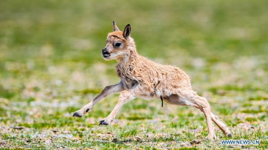 File photo taken on June 24, 2017 shows a baby Tibetan antelope in Xainza County, southwest China's Tibet Autonomous Region. With efforts from top to bottom, the Tibetan antelope population in Tibet has risen from around 50,000 in the 1990s to more than 200,000 today. The species has been brought back from the brink of extinction. (Xinhua/Purbu Zhaxi)