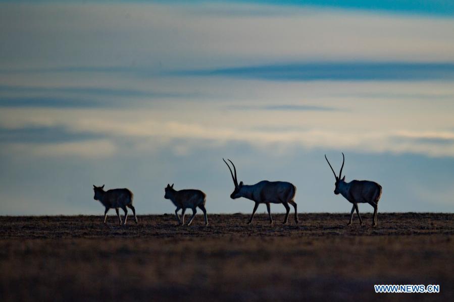 Photo taken on Jan. 31, 2019 shows Tibetan antelopes in Shuanghu County, southwest China's Tibet Autonomous Region. With efforts from top to bottom, the Tibetan antelope population in Tibet has risen from around 50,000 in the 1990s to more than 200,000 today. The species has been brought back from the brink of extinction. (Xinhua/Sun Fei)