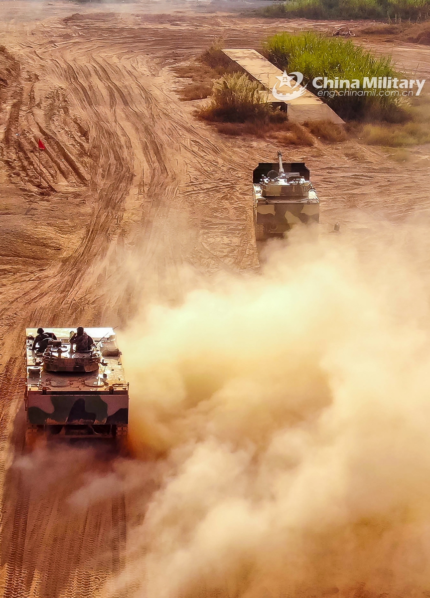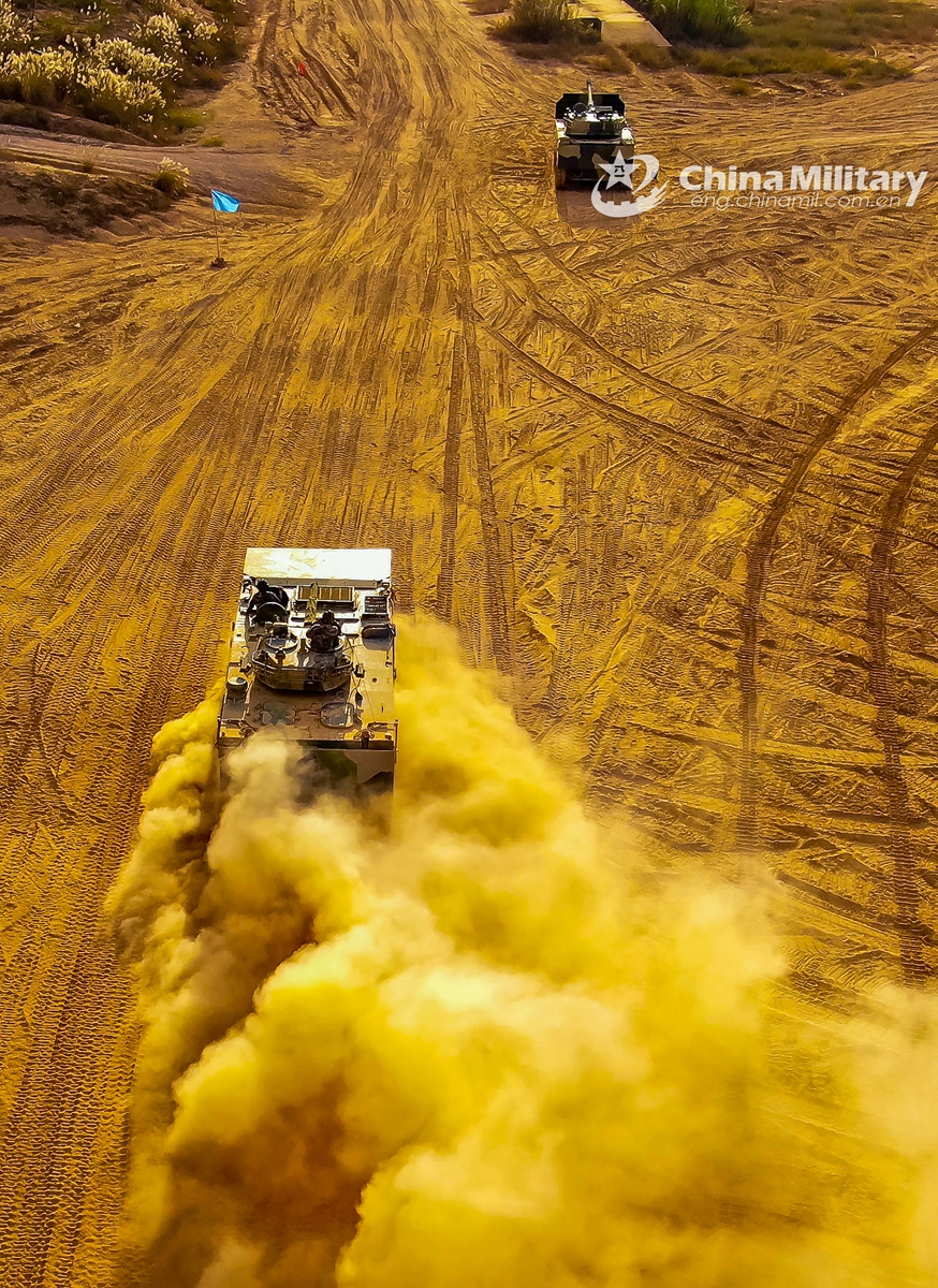 Armored vehicles attached to a combined arms brigade under the PLA 73rd Group Army rumble through a mound of dust during a driving skills training exercise on December 3, 2020. (eng.chinamil.com.cn/Photo by Xia Tao)