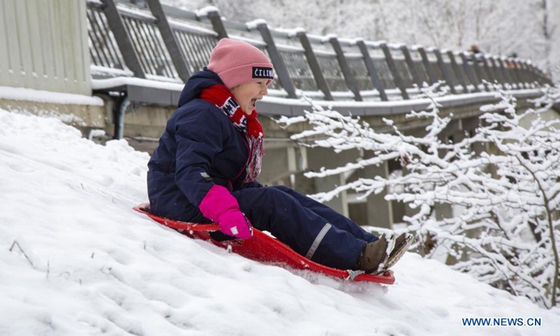 A girl enjoys a ride on a toboggan in Ogre, Latvia, on Dec. 26, 2020. (Photo by Edijs Palens/Xinhua)