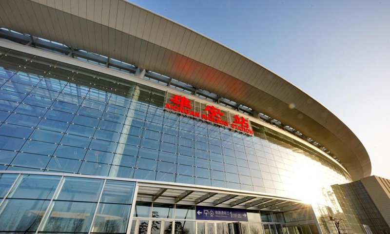 Photo taken on Dec. 23, 2020 shows the entrance of Beijing-Xiongan intercity railway's Xiongan Railway Station in Xiongan New Area, north China's Hebei Province. The construction of Beijing-Xiongan intercity railway's Xiongan Railway Station has entered the final stage and the station will be put into operation by the end of this year. (Xinhua/Mu Yu)