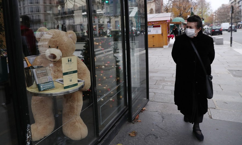 A woman wearing a mask waits for crossing the street in Paris, France, Dec. 9, 2020. (Xinhua/Gao Jing)