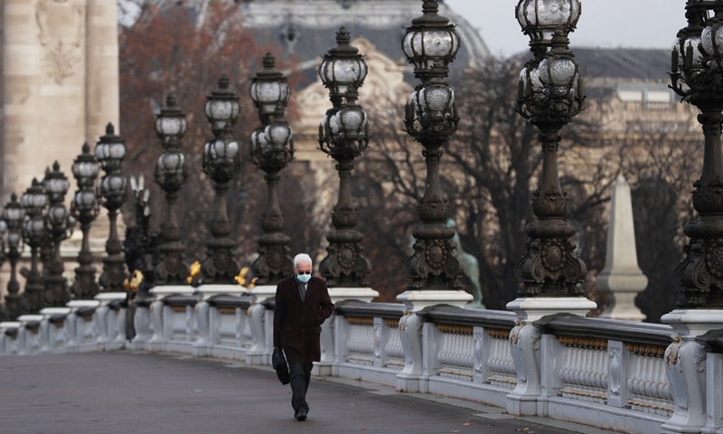 A man wearing a mask walks on the Pont Alexandre III bridge in Paris, France, Dec. 9, 2020. (Xinhua/Gao Jing)