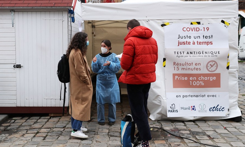 A nurse talks with people outside a test screening tent in Paris, France, Dec. 16, 2020. (Xinhua/Gao Jing)