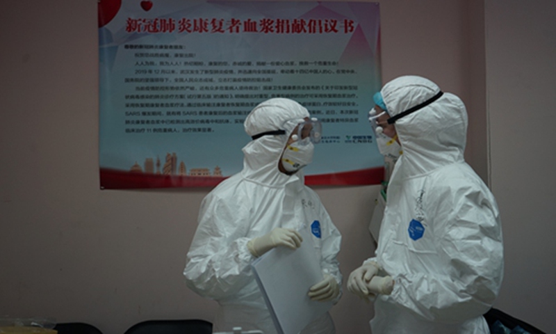 Two medical staffers at a designated plasma collection center of the Shanghai Public Health Clinical Center Photo: Chen Xia/GT