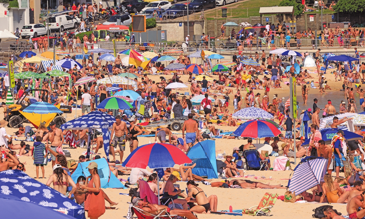 Large crowds are seen at Bondi Beach on Sunday in Sydney, Australia. New South Wales has recorded seven cases of COVID-19 community transmission overnight. All cases are linked to the northern beaches. Six have been traced to the Avalon cluster, while one case is under investigation. Photo: VCG