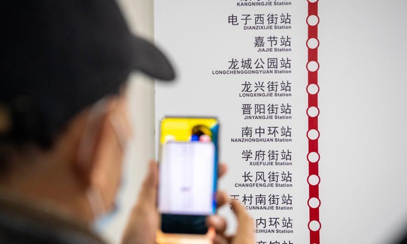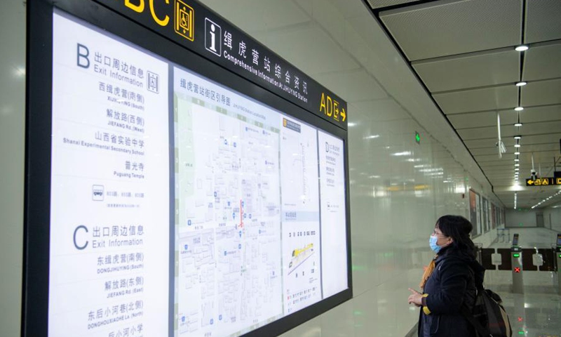 A woman looks at station information at Jihuying Station of Taiyuan Subway Line 2 in Taiyuan, capital city of north China's Shanxi Province, Dec. 26, 2020. The first phase of Taiyuan Subway Line 2, with a total length of 23.647 km and 23 stations, was officially put into operation on Saturday. It is the first subway in Shanxi. (Xinhua/Yang Chenguang)
