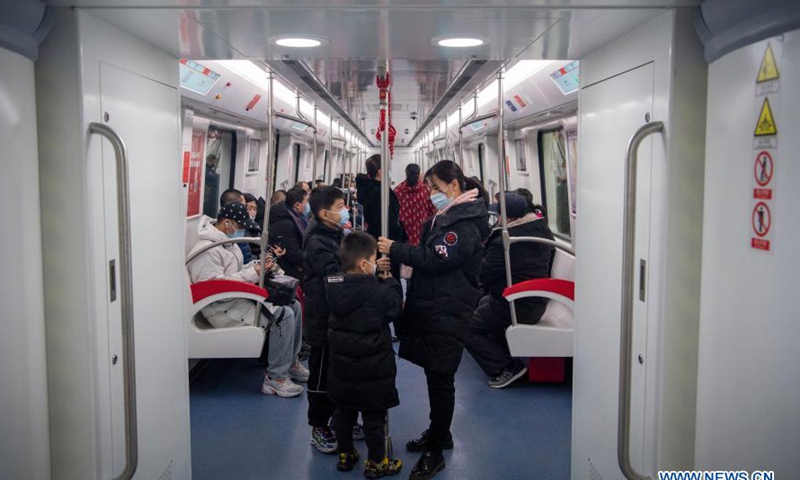 People are seen on a train of the Taiyuan Subway Line 2 in Taiyuan, capital city of north China's Shanxi Province, Dec. 26, 2020. The first phase of Taiyuan Subway Line 2, with a total length of 23.647 km and 23 stations, was officially put into operation on Saturday. It is the first subway in Shanxi. (Xinhua/Yang Chenguang)