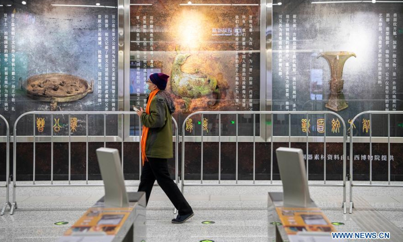 A resident walks at Dananmen Station of Taiyuan Subway Line 2 in Taiyuan, capital city of north China's Shanxi Province, Dec. 26, 2020. The first phase of Taiyuan Subway Line 2, with a total length of 23.647 km and 23 stations, was officially put into operation on Saturday. It is the first subway in Shanxi. (Xinhua/Yang Chenguang)