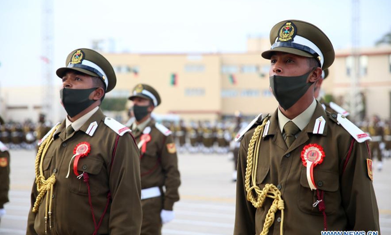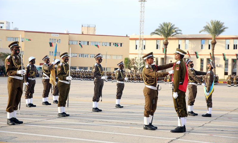 Graduates of the Libyan air force academy and military academy attend the graduation ceremony in the military college of Tripoli in Libya on Dec. 26, 2020. Turkish Defense Minister Hulusi Akar on Saturday met with Minister of Defense of the UN-backed Libyan government, Salahaddin Namroush, in Libyan capital Tripoli and discussed security cooperation between the two countries. Akar attended the graduation ceremony in the military college of Tripoli on the same day. (Photo by Hamza Turkia/Xinhua)