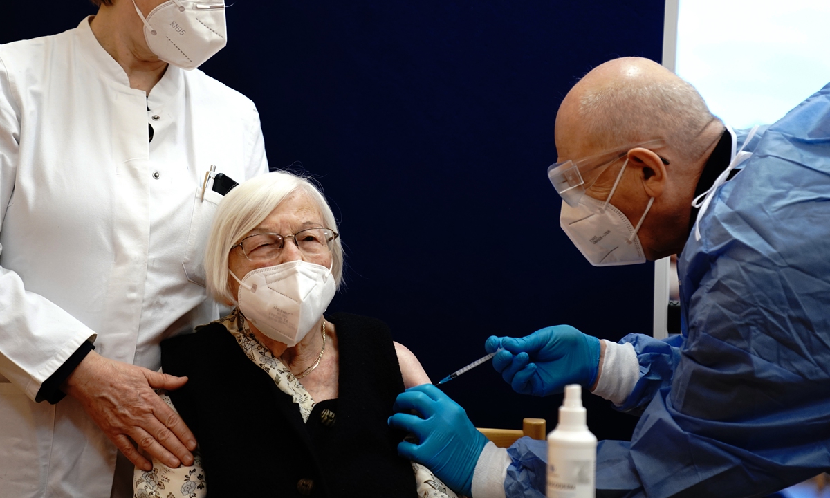101-year-old Gertrud Haase (center) is given a dose of the Pfizer-Biontech COVID-19 coronavirus vaccine by doctor Fatmir Dalladaku (right) at a nursing home in Berlin on Sunday. The European Union began a vaccine rollout, even as countries in the bloc were forced back into lockdown by a new strain of the virus, believed to be more infectious, that continues to spread from the UK. The pandemic has claimed more than 1.7 million lives and is still running rampant in much of the world, but the recent launching of innoculation campaigns has boosted hopes that 2021 could bring a respite. Photo: AFP
