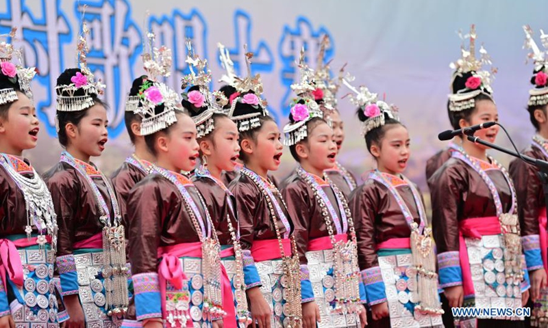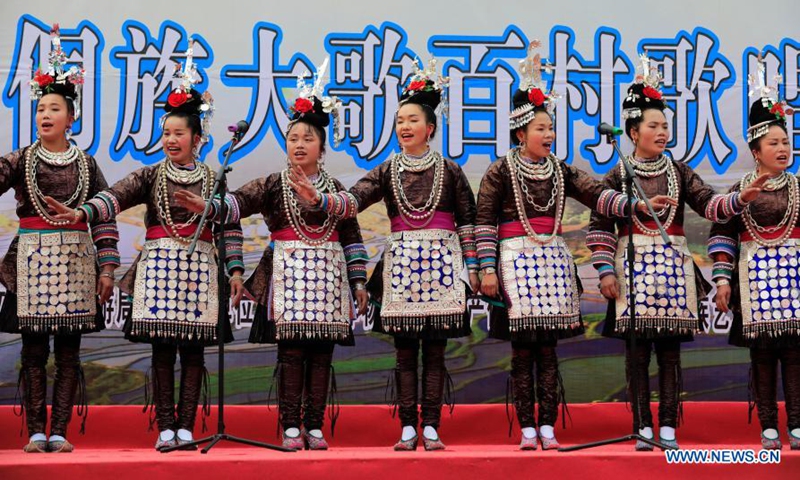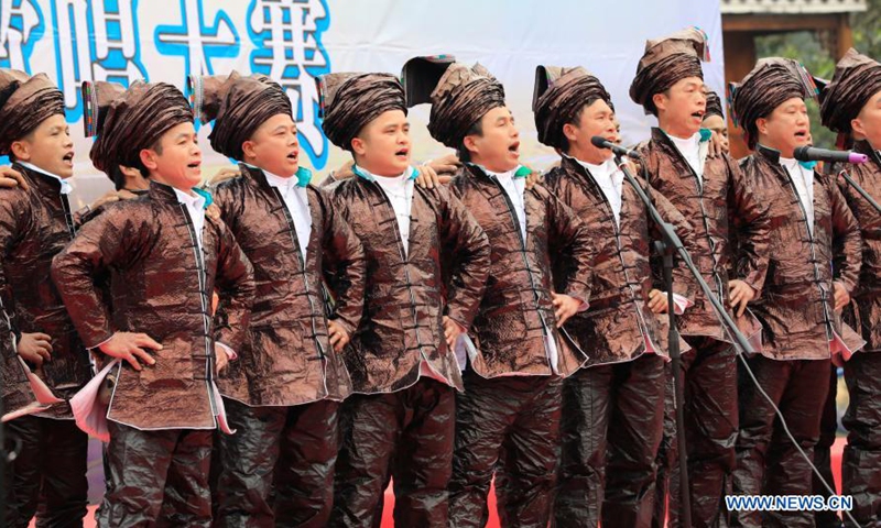 Singers perform during a Dong ethnic group chorus competition held in Congjiang County, southwest China's Guizhou Province, Dec. 27, 2020. A total of 78 choirs from the province's Congjiang and Liping counties participated in the competition on Sunday. Dong songs, the folk songs of the Dong ethnic group, are performed with a group of people to make a polyphonic singing called Kam Grand Choir without musical instruments or a conductor. It was inscribed on the World Intangible Cultural Heritage List in 2009. (Photo by Luo Jinglai/Xinhua)