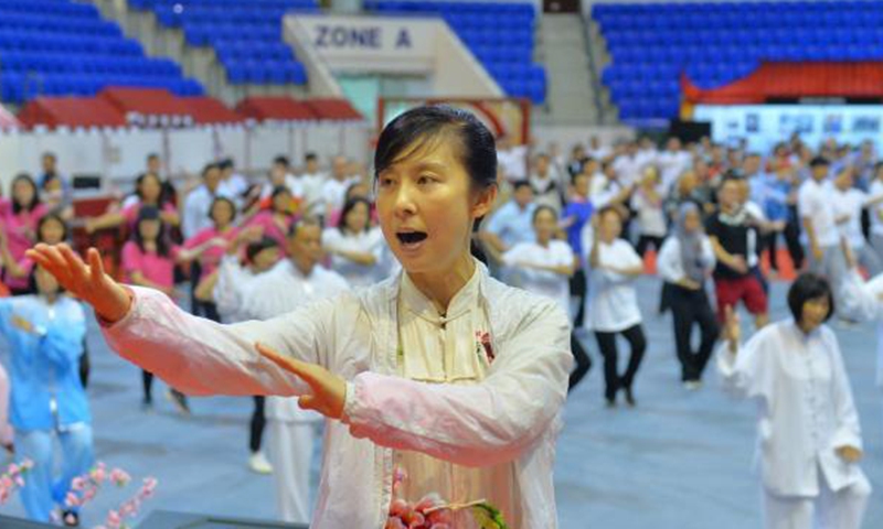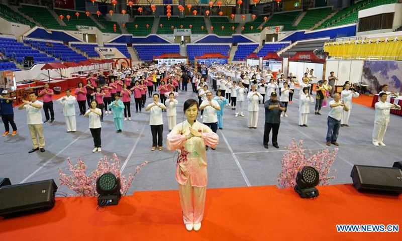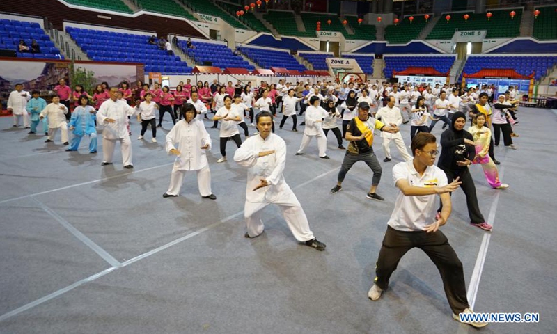 People practise Taijiquan at an indoor stadium in Bandar Seri Begawan, capital of Brunei, on Dec. 27, 2020. Various Taijiquan practice events were held simultaneously in Bandar Seri Begawan on Sunday. The United Nations Educational, Scientific and Cultural Organization (UNESCO) inscribed China's Taijiquan on the Representative List of the Intangible Cultural Heritage of Humanity this December. (Photo by Jeffrey Wong/Xinhua)