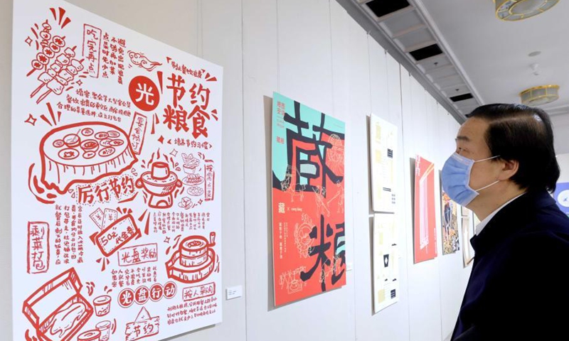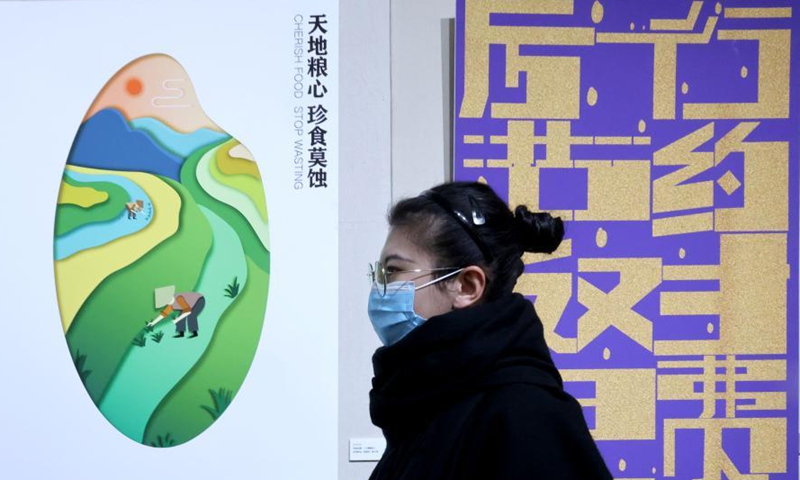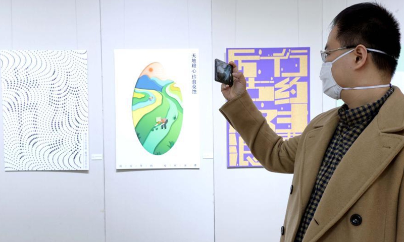 A visitor views award-winning works at a public benefit design activity themed on promoting thrift and curbing waste in Beijing, capital of China, Dec. 27, 2020. The works release ceremony of the activity was held in Beijing on Sunday. All the award-winning works will be offered to public cultural and tourist facilities for free. (Xinhua/Chen Jianli)