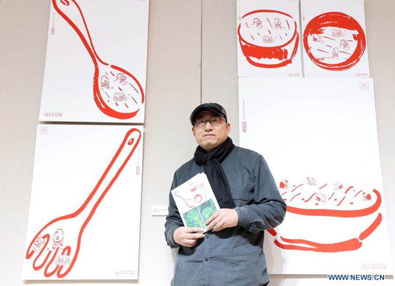 Liu Xin, associate professor from Shanghai Academy of Fine Arts, poses for photos in front of his award-winning works at a public benefit design activity themed on promoting thrift and curbing waste in Beijing, capital of China, Dec. 27, 2020. The works release ceremony of the activity was held in Beijing on Sunday. All the award-winning works will be offered to public cultural and tourist facilities for free. (Xinhua/Chen Jianli)