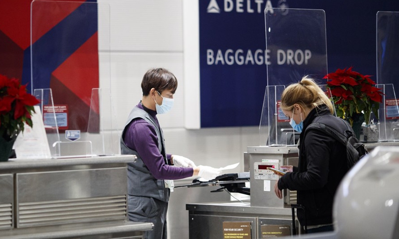 An airline worker helps a holiday traveler check in at Ronald Reagan Washington National Airport in Arlington, Virginia, the United States, on Dec. 23, 2020. (Photo by Ting Shen/Xinhua)