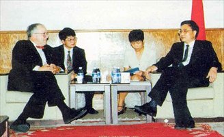 1993-1998 First member, Secretariat, CYL Central Committee; president, China Youth University for Political Sciences (1988-1994: studied economics in an in-service postgraduate program at the School of Economics at Peking University, and awarded the degrees of Master of Economics and Doctor of Economics) Li Keqiang (right) meets with a representative of the US Congressional Staff Delegation while serving as First member of the Secretariat of the Communist Youth League (CYL) Central Committee in August, 1997. (Photo: ifeng.com) |