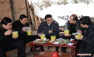 2007-2008 Member, Standing Committee, Political Bureau, CPC Central Committee File photo taken on Jan. 31, 2008 shows Li Keqiang eats instant noodles with his colleagues as they talk about disaster relief work in the snowstorm-stricken Ziyun Village of Laojun Township of Xuanhan County in southwest China's Sichuan Province. Photo: Xinhua |