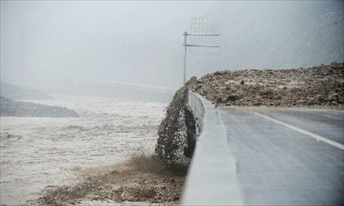 Landslides hit the landslide-hit Duwen Expressway linking Dujiangyan City and Wenchuan County in southwest China's Sichuan Province, July 10, 2013. Rainstorms battered the region in these two days. Photo: Xinhua