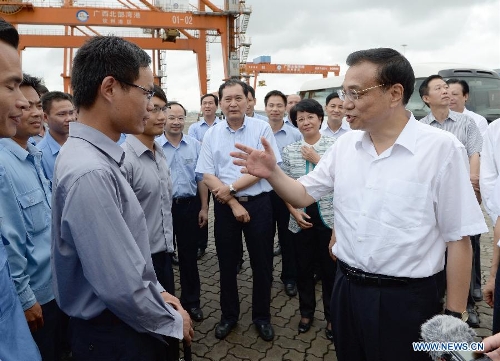 Chinese Premier Li Keqiang (R front) visits a port in Qinzhou, south China's Guangxi Zhuang Autonomous Region, July 8, 2013. Li made a research tour in Guangxi from July 8 to 10. (Xinhua/Ma Zhancheng)
