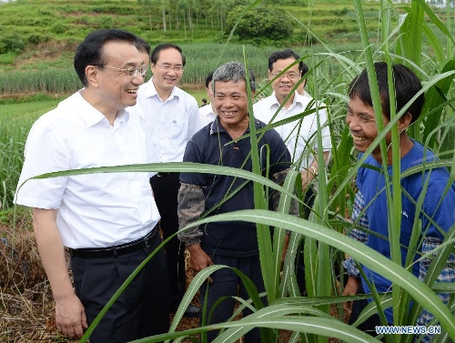 Chinese Premier Li Keqiang (L front) talks with farmers at a sugarcane plantation in Chongtao Village, Nanning, capital of south China's Guangxi Zhuang Autonomous Region, July 9, 2013. Li made a research tour in Guangxi from July 8 to 10. (Xinhua/Ma Zhancheng)