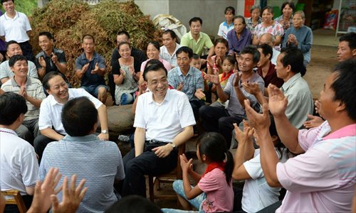 Chinese Premier Li Keqiang (C) talks with villagers in Tanliang Village, Nanning, capital of south China's Guangxi Zhuang Autonomous Region, July 9, 2013. Li made a research tour in Guangxi from July 8 to 10. (Xinhua/Ma Zhancheng)