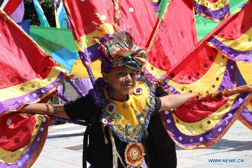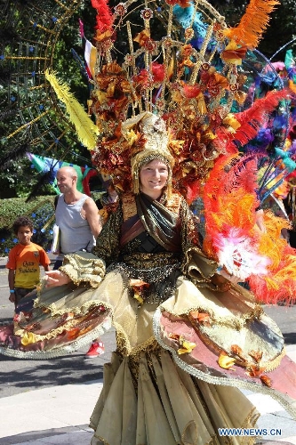 A woman from a Caribbean country performs during the opening of the Edinburgh Festival Carnival in Edinburgh, Britain, July 21, 2013. The Edinburgh Festival Carnival started on Sunday with music, dance, costumes, and street entertainment in all shapes, sizes, and sounds. With free admission for all, a total of 400 performers from Caribbean countries, Spain, Poland, Hungary, France, China and Britain among others presented over 35 colorful and fantastic acts to the audiences and visitors. (Xinhua/Guo Chunju)