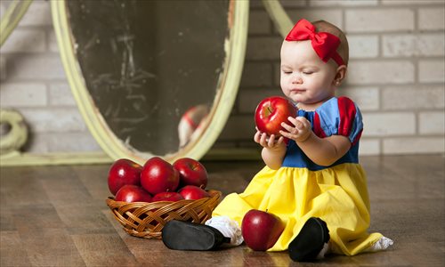 Baby Maddie in a scene from Snow White pondering her apple Photo: IC