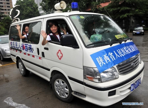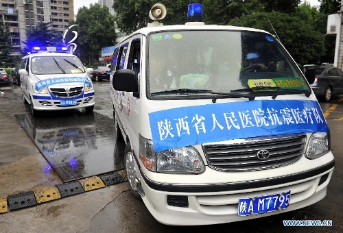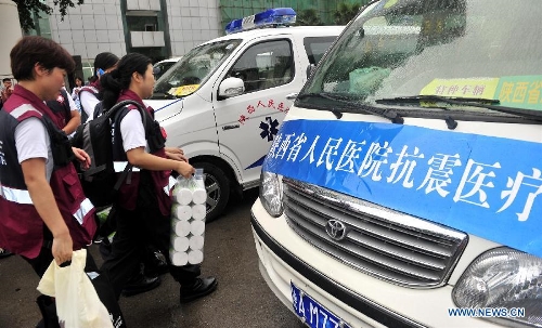 Photo taken on July 22, 2013 shows members of a medical team heading for the quake-stricken region in the neighboring Gansu Province, in Xi'an, northwest China's Shaanxi Province. A 6.6-magnitude earthquake jolted a juncture region of Minxian County and Zhangxian County in Dingxi City of northwest China's Gansu Province Monday morning. (Xinhua/Yuan Jingzhi)