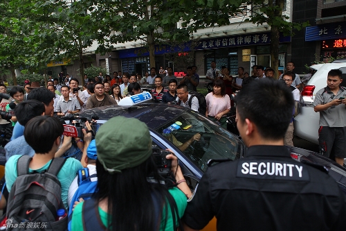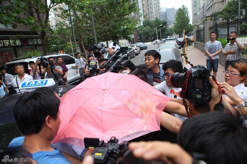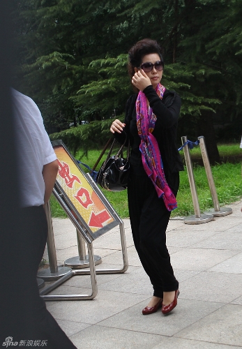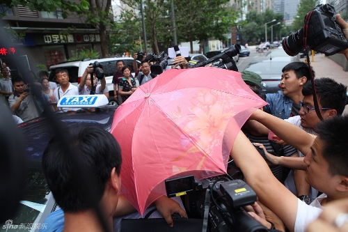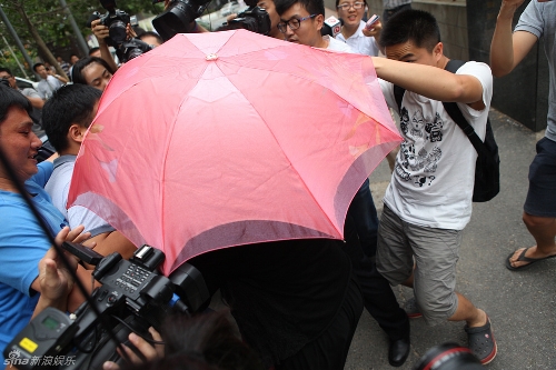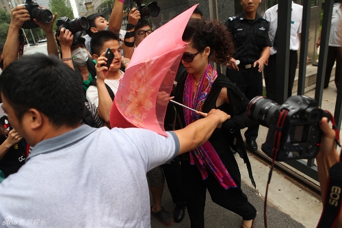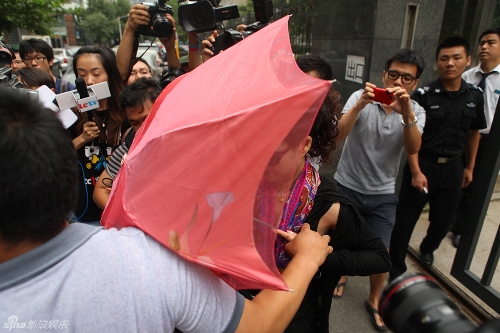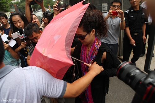 Sunglasses-covered Meng Ge, mother of Li Tianyi, a PLA singer general's son charged with gang rape, left the Haidian District Court in Beijing on Monday. Li Tianyi didn't show up. Li Tianyi, the 17-year-old son of Li Shuangjiang, a famous singer in the People's Liberation Army, is accused along with four others of raping a girl at a hotel in Beijing in February. His lawyer insisted that Li plead not guilty. (Photo Source: ent.sina.com)