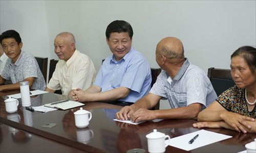 Chinese President Xi Jinping (C), who is also general secretary of the Communist Party of China (CPC) Central Committee, talks with villagers during a meeting at Dongshan Village of Changgang Township in E'zhou City, central China's Hubei Province, July 22, 2013. Xi made an inspection tour in Hubei from July 21 to July 23. Photo: Xinhua